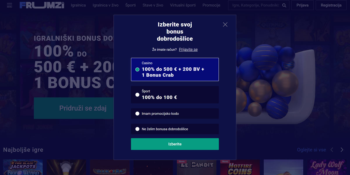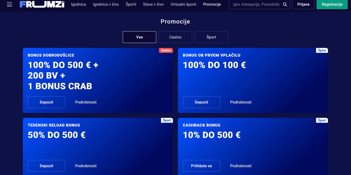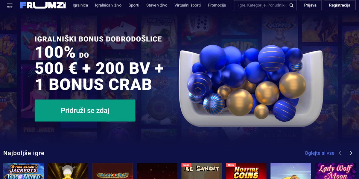 Da, Frumzi Casino sprejema igralce iz Slovenije. Slovenski uporabniki se lahko registrirajo, opravijo polog in dostopajo do iger v igralnici, miz s krožilci v živo in funkcij stavnice, glede na trenutno regionalno razpoložljivost platforme.