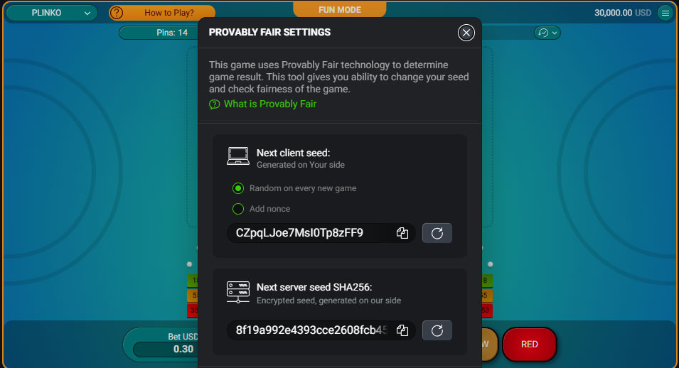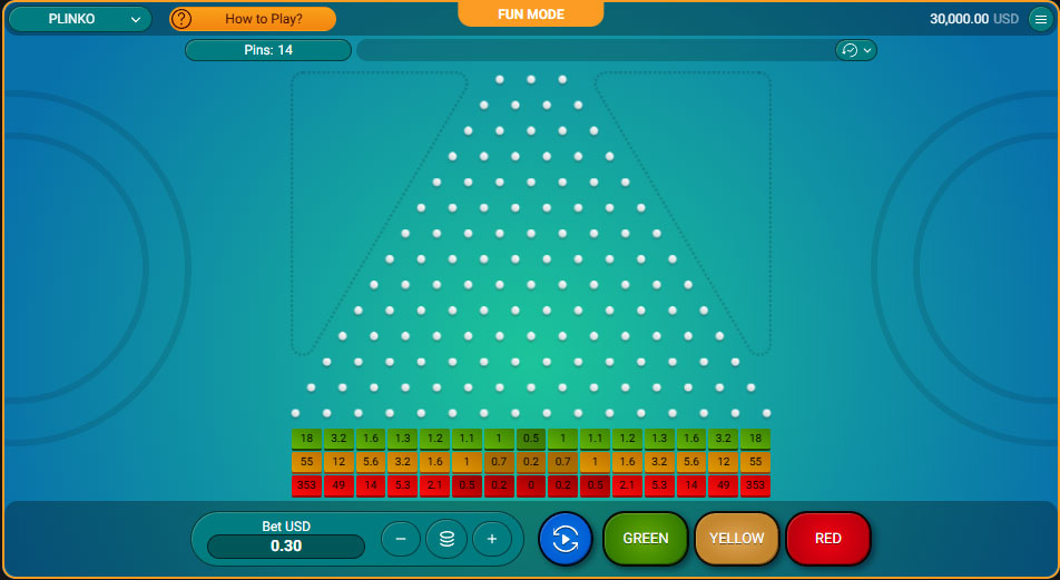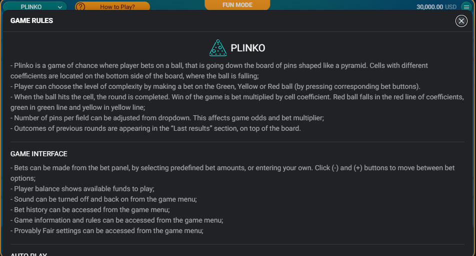 Plinko ponuja preprosto in intuitivno igranje, kjer igralci preprosto pritisnejo gumb »Igraj«, da spustijo žogice z vrha piramide. Žogice naključno odskakujejo v celice z različnimi vrednostmi, ki naraščajo od središča proti robovom, ustrezen znesek pa se samodejno doda igralčevenu stanju.