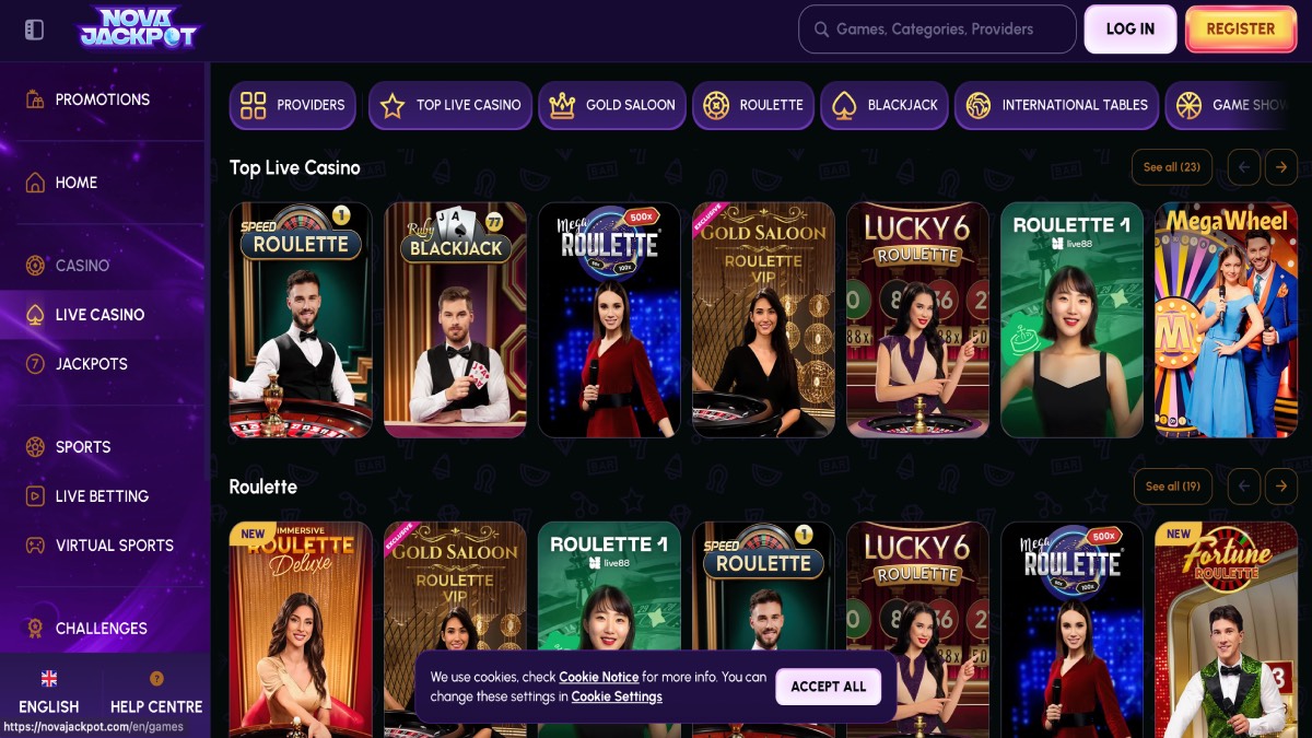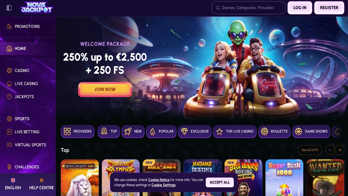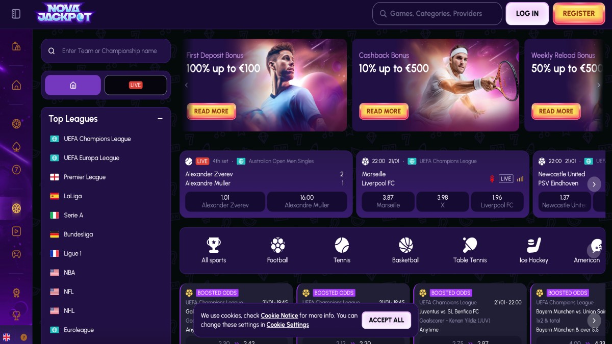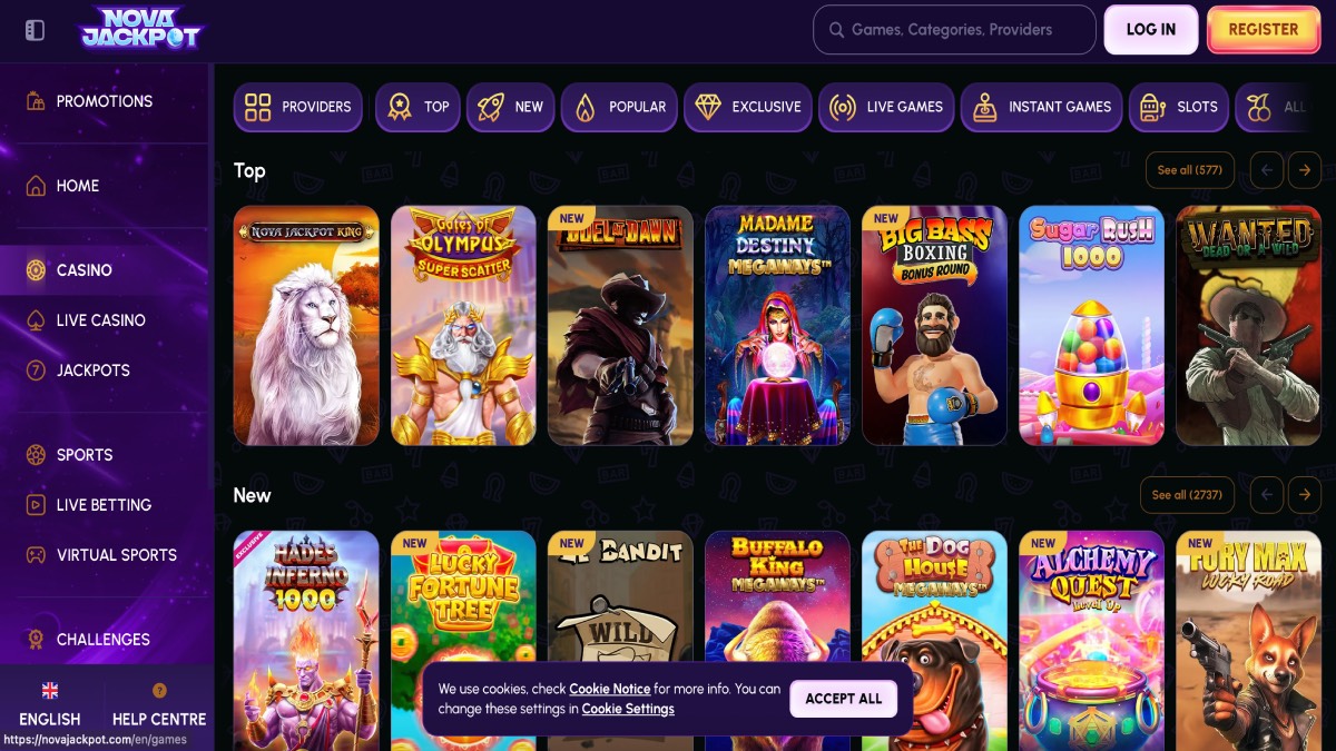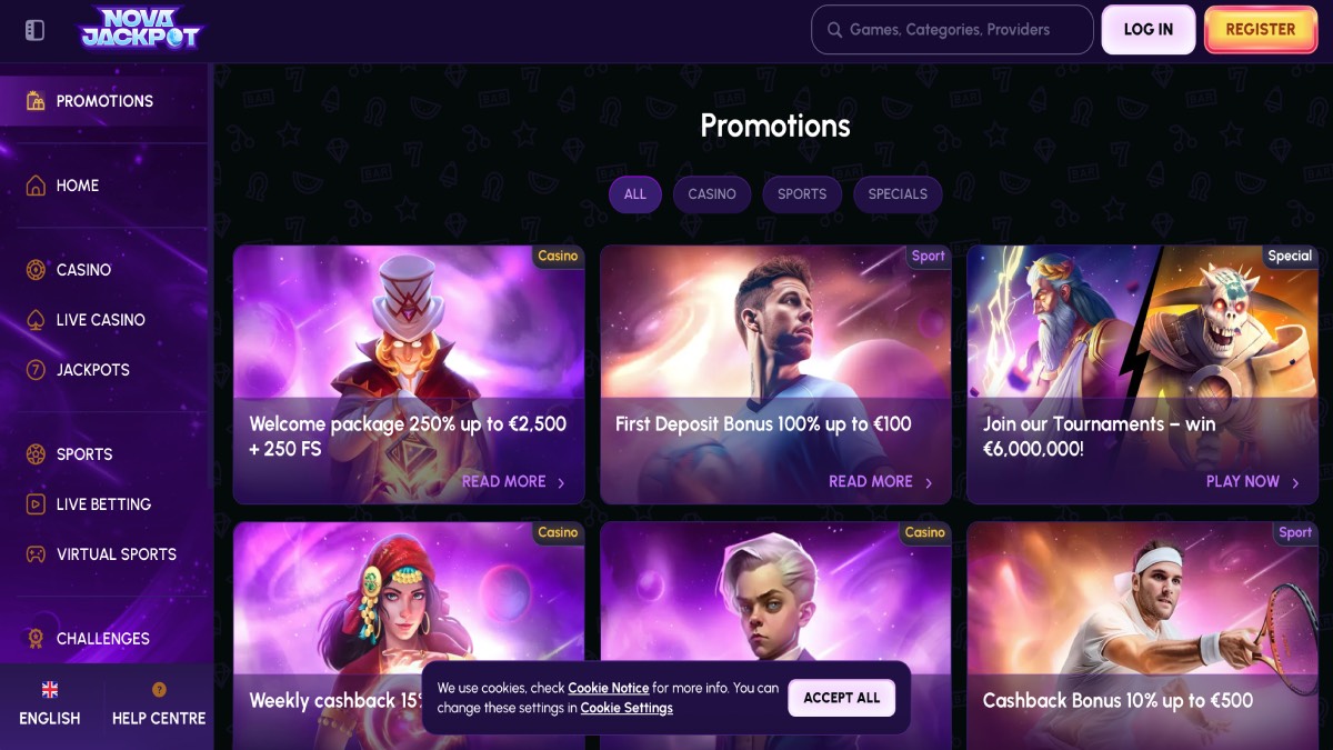 NovaJackpot Casino je celovita spletna igralnica in platforma za športne stave, ki združuje široko izbiro iger s športnimi stavami, redne promocije, turnirje in večstopenjski VIP sistem. Z modernim vmesnikom in obsežnimi možnostmi igranja platforma ponuja tako igralniške igre kot športne stave iz enega samega računa in nadzorne plošče.
