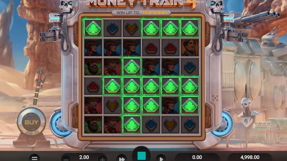 Money Train 4 uporablja mrežo 6×6 s Scatter Pays, kar pomeni, da se zmage oblikujejo z ujemanjem simbolov kjerkoli na sosednjih bobnih, namesto vzdolž fiksnih zmagovalnih linij. Igra uporablja mehaniko tipa plazov, kjer zmagovalni simboli izginejo in novi simboli zdrsnejo navzdol, kar ustvarja priložnosti za več zmag iz enega samega vrtenja. Ta dinamični sistem tvori hrbtenico osnovne igre in pripravi tabla na bonus kroge.