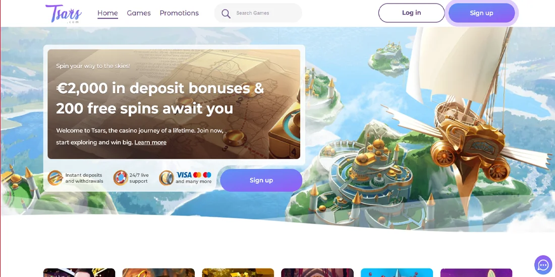 Tsars Casino je spletna igralnica, ki ponuja velik dobrodošli bonus v višini 2.000 € in 200 Brezplačnih Vrtljajev, vidno predstavljen na njeni uradni strani. Platforma gosti široko izbiro iger na srečo, vključno z igralnimi avtomati in številnimi drugimi naslovi, ki jih igralci lahko brskajo prek seznama iger. Objavljeni splošni pogoji poslovanja zahtevajo, da so uporabniki stari nad 18 let in se strinjajo s pravili igralnice ter postopki KYC pred igranjem, pokrivajo pa tudi postopke registracije in preverjanja računa. Plačila in igranje se obravnavajo prek spletnega mesta s poudarkom na odgovorni igri in jasnih obveznostih uporabnika.